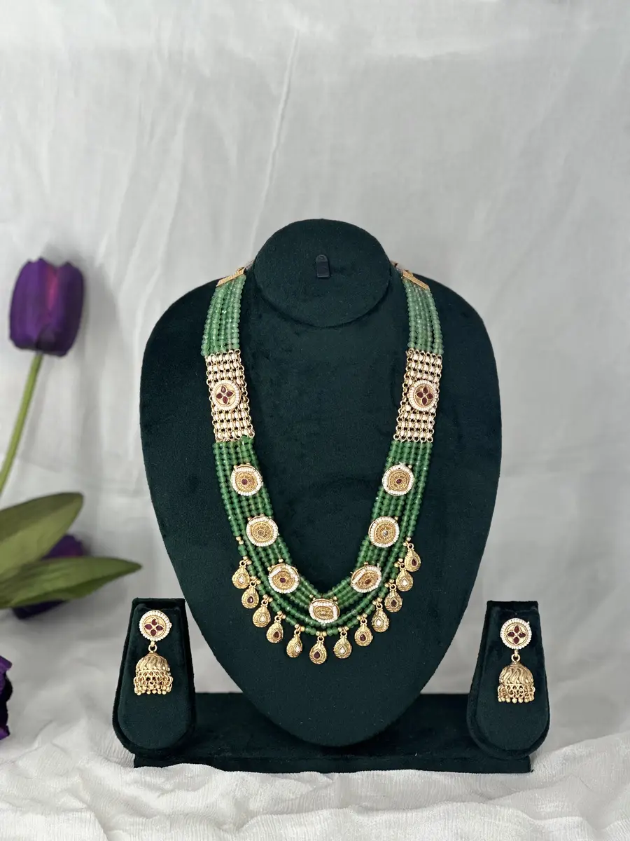 Add a regal touch to your ethnic ensemble with this elegant Green Beaded Rajwadi Long Necklace Set, crafted in a rich antique gold finish. This premium artificial jewellery long necklace features multiple strands of deep green beads, beautifully complemented by intricately designed gold-tone elements with traditional stone detailing.