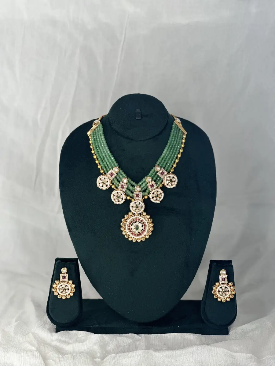 Enhance your ethnic look with this elegant Green Beaded Rajwadi Necklace Set, crafted in a rich antique gold finish. This premium artificial jewellery necklace set features multiple strands of deep green beads, beautifully accented with traditional stone-studded motifs and a striking round centerpiece pendant inspired by classic royal designs.